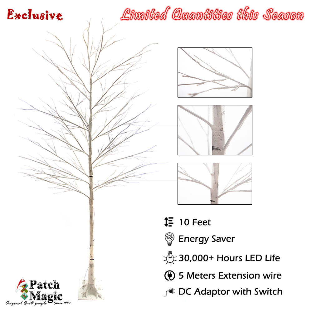 10ft Prelit Christmas Tree Birch LED lighted tree with 240 warm white LEDs. This white tree is made up of a realistic looking artificial trunk on stable square base with adjustable branches. LED trees can be used all year round. Use not just at Christmas, also for Halloween and other ceremonial, festival home decoration and yard decoration. Indoor and outdoor use. Hang your ornaments for any festive occasion.