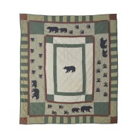 The Quilt pillows and the bedspread borders of handmade patch magic, have the original bear trail and their foot prints in the interior border. The rectangular green strip and the four green squares with the cream white background in the centre and the chocolate brown frill border brings in an earth’s natural setting.