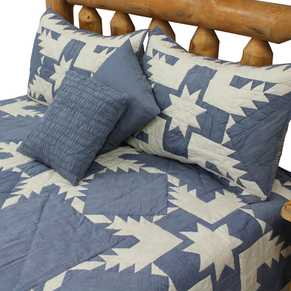 With only blue and white colours, the created designs of feathered stars is the most difficult and intricate of all star patterns, embedded on creamy white crosses which makes it a soft and mild and dreamy bed to lie on.
