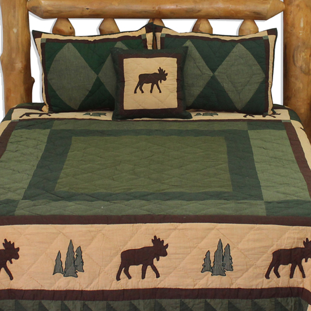 The forest green light Quilt makes you feel as if you are in the woods with chocolate brown borders and with moose surrounding you which will incite and increase your delight.