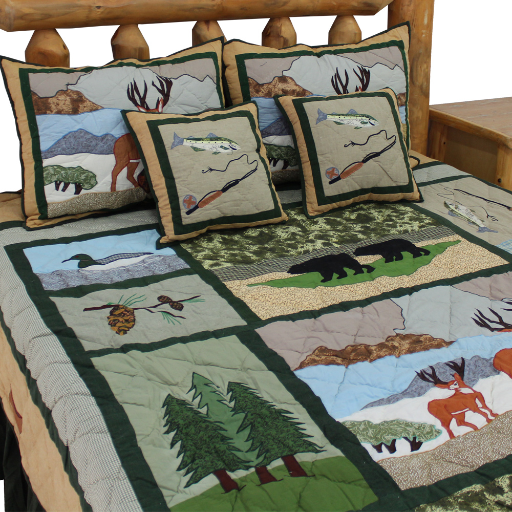 Lodge fever quilt in earthy browns and forest greens will make you feel as if you’re in the wilderness. The Quilt adorns the paired bears walking on a green grassy field near the coniferous trees while bucks and stag stare at them with fear. The seagull snatching away a fish from the sea, are special features. The image of fish, fishing rods and reels on the quilt pillows form another added attraction.