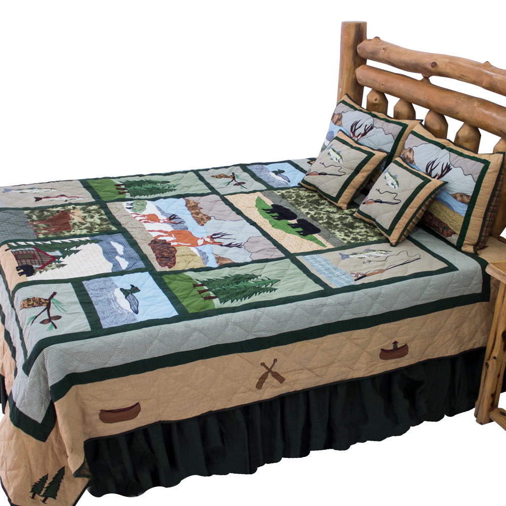 Lodge fever quilt in earthy browns and forest greens will make you feel as if you’re in the wilderness. The Quilt adorns the paired bears walking on a green grassy field near the coniferous trees while bucks and stag stare at them with fear. The seagull snatching away a fish from the sea, are special features. The image of fish, fishing rods and reels on the quilt pillows form another added attraction.