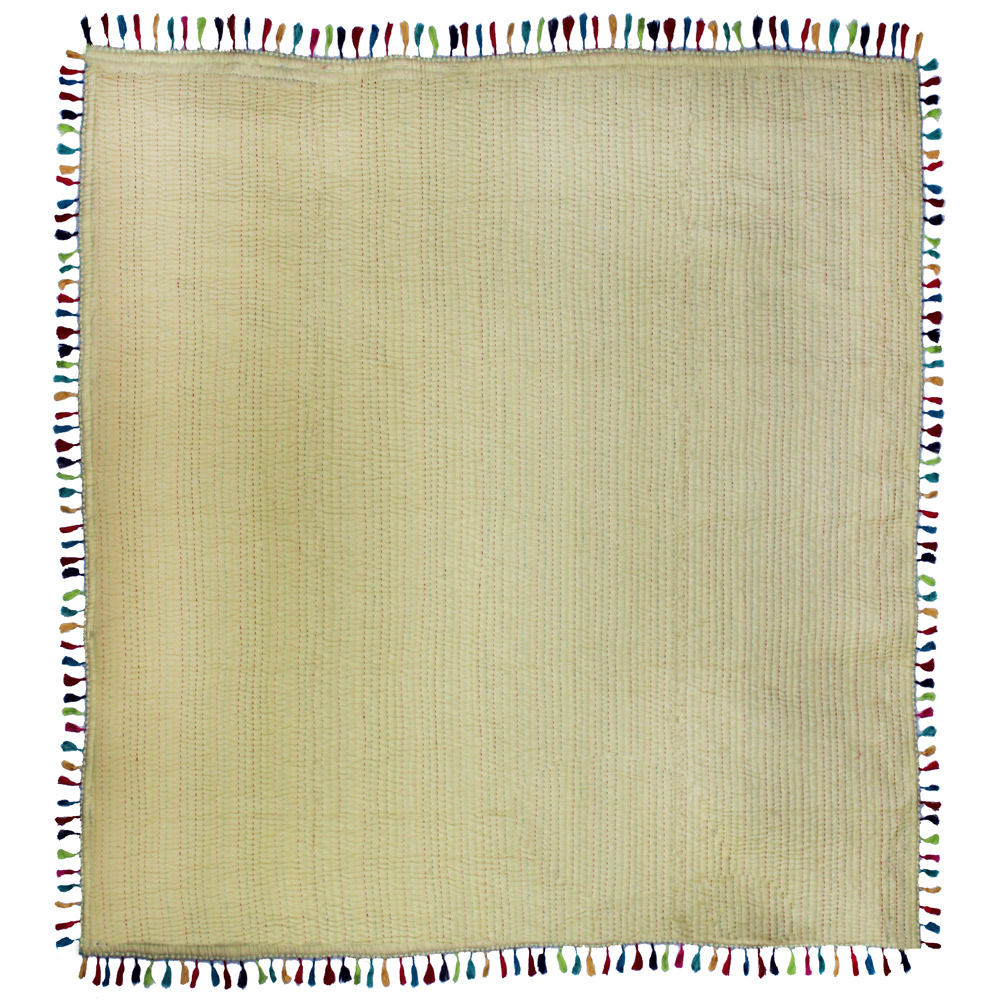 Rainbow colored pick-stitches on your favorite tan fabric, a neutral base, gives the needed elan and the added panache comes from the handmade multi colored tassels dangling all around and makes this quilt irresistible.This tassled collection uses an age old traditional method of quilting to keep wads of fabric together to ward off the cold