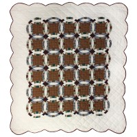 The spirit of the deciduous forest towering into the clouds is embedded in this quilt with forging the double wedding ring style with the colour of the Woodland forest as its feature and the white rounded border.