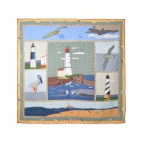 Scenes of the lighthouse by Bay quilt magnificently display details of a light house by the sea. This serene scene with flying seagulls over deep blue seas and waves crashing in to the rocks, you can almost feel the mist spraying on your face. A truly tranquil setting. Three lighthouses are portrayed in this Quilt with the middle one standing majestically on a rocky seashore bay. The seagulls flying above the sea forms another added attraction. The swan, the stork on the seashore and the birds serenely walking on the sandy beach are other features which will attract you.